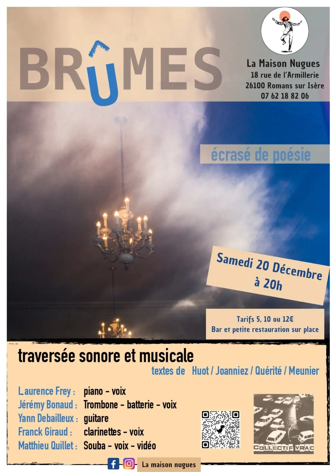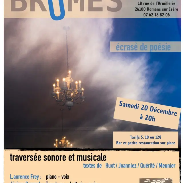 Brûmes, c’est un écrasé de poésie à déguster le sourire au lèvre et l’esprit vif, une balade sonore musicale et textuelle dense et intense, matinée d’images vidéos improvisées.