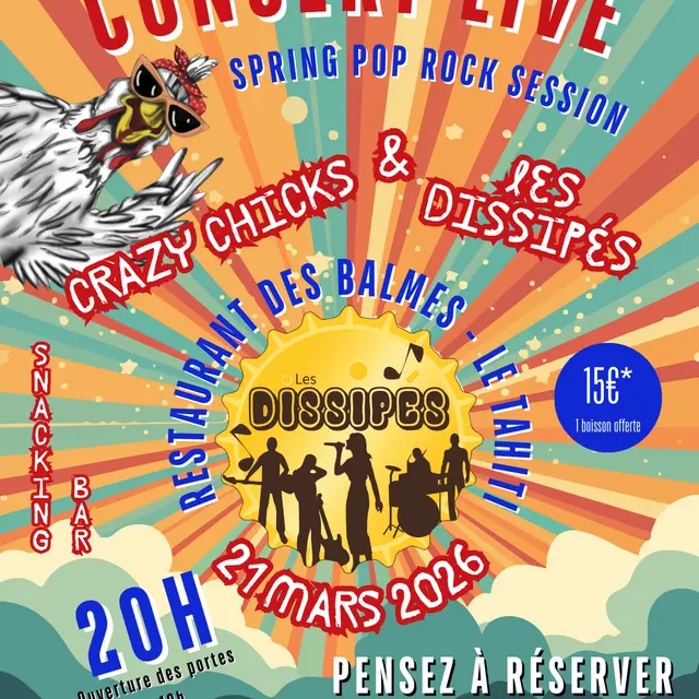 Rendez-vous au Restaurant Le Tahiti à Romans-sur-Isère pour une soirée 100% live avec deux groupes pop rock : Les Crazy Chicks & Les Dissipés prêts à vous faire vibrer ! Ambiance chaleureuse, énergie sur scène et moment convivial garantis.