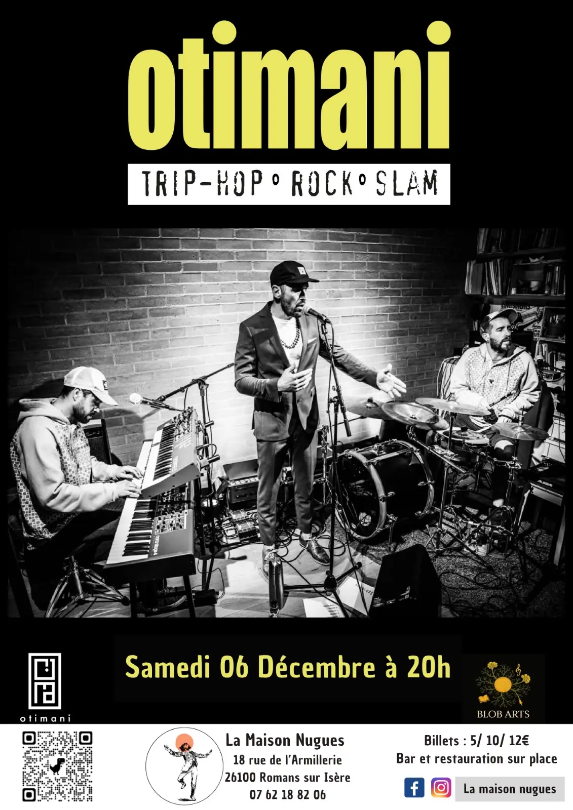 Otimani, un projet musical et poétique audacieux, où se rencontrent les sonorités envoutantes du trip hop, l’intensité́ brute du rock et la puissance du slam de poésie.