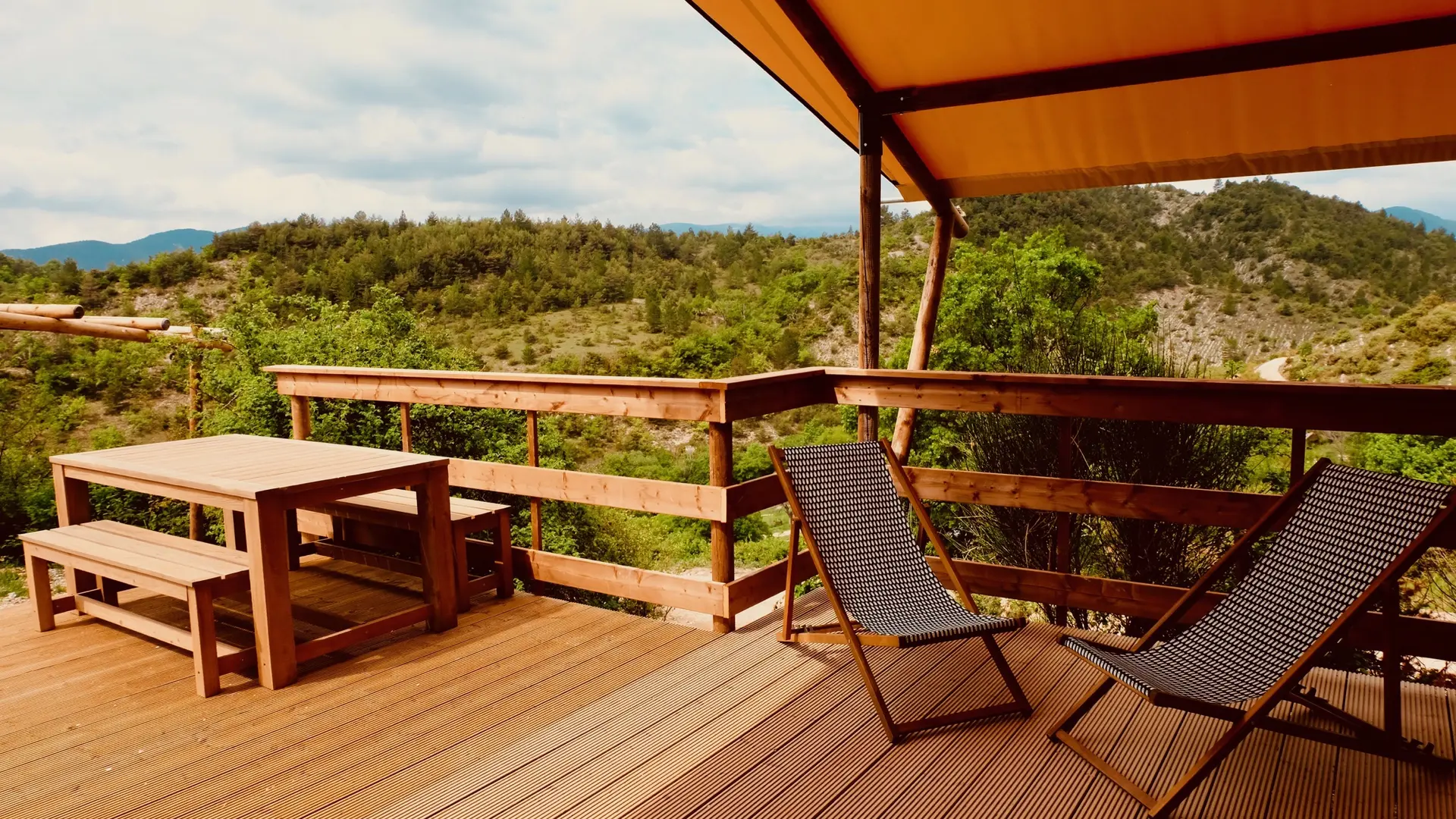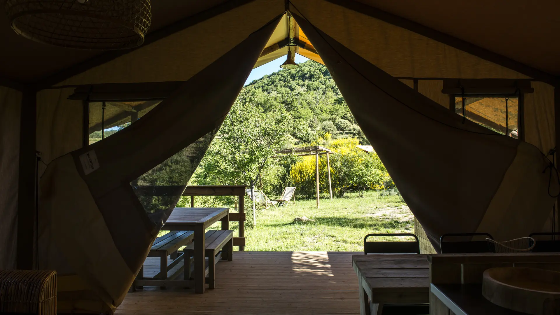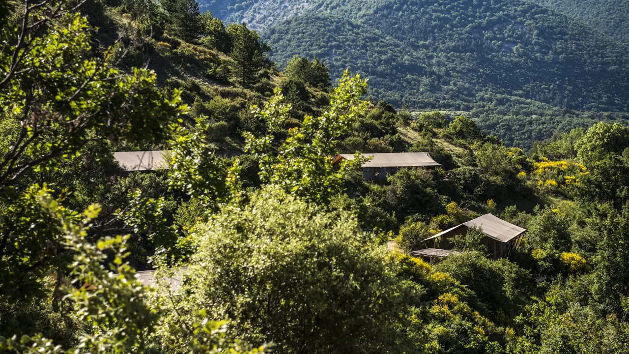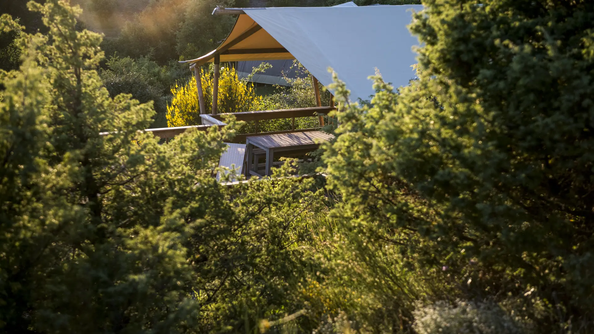 Un cadre magique où 4 Lodges de toile et de bois incitent à une véritable parenthèse au cœur de la nature. Installées à flanc de colline, les Lodges surplombent les 100 hectares de nature.
