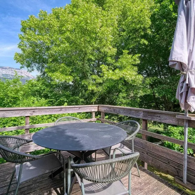 Etage 1 : séjour avec coin salon (canapé convertible, poêle à bois et grande baie vitrée) donnant sur la terrasse, cuisine, salle d'eau. Etage 2 : 1 ch. mansardée (1x140), mezzanine (2x70, 1x90). Chauffage central à bois déchiqueté.