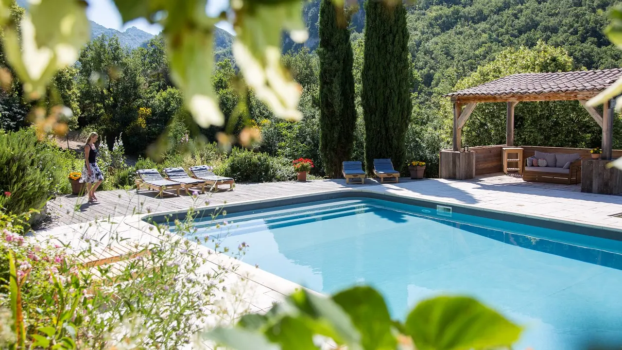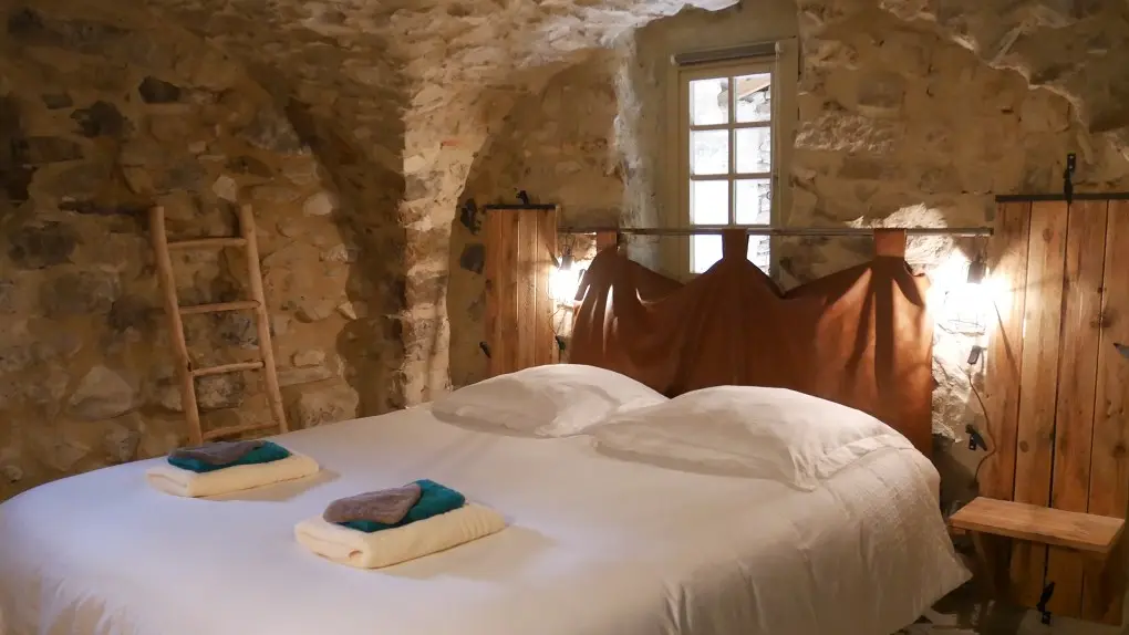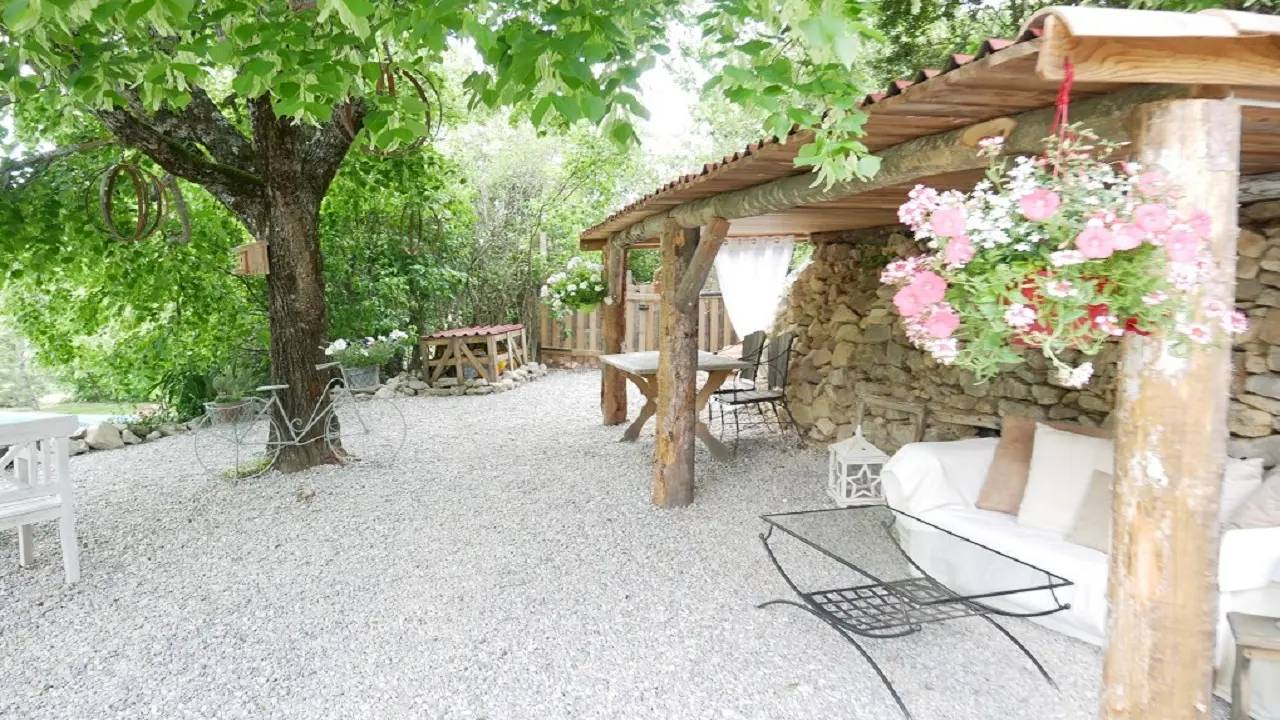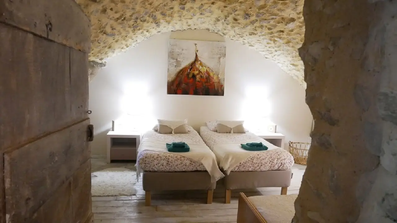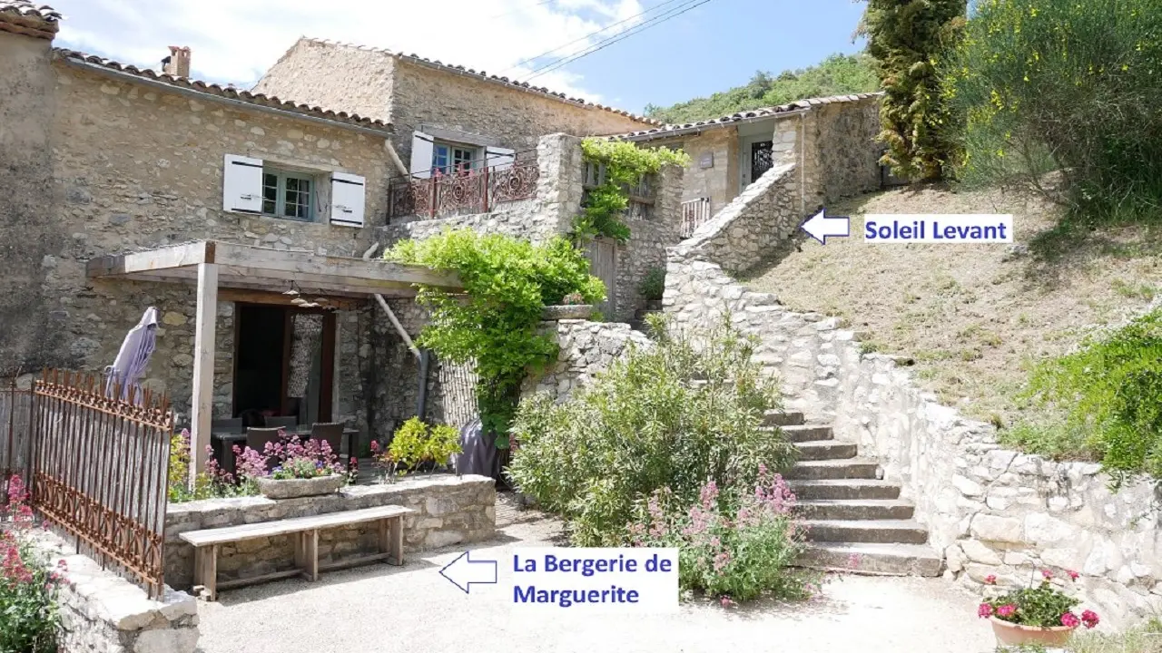 Gîte de charme de 72 m² en rez-de-jardin pour 4 personnes dans une ancienne bergerie au cœur de la nature, 2 belles chambres voûtées, terrasse privée avec jolie vue sur les montagnes environnantes. Grande piscine partagée. Calme et authenticité assurés !