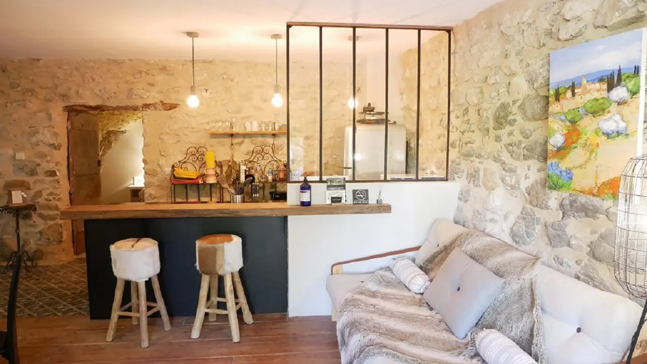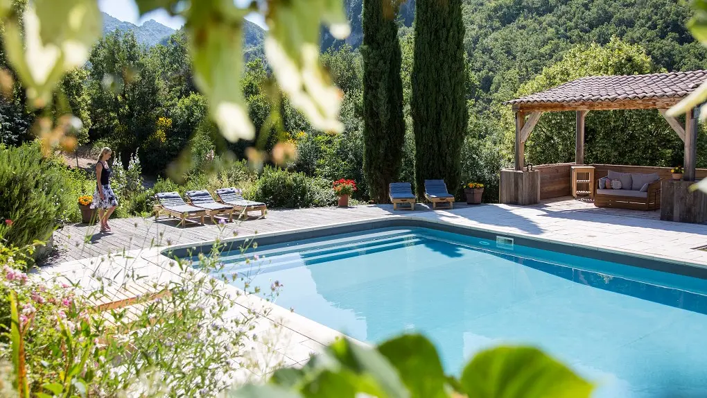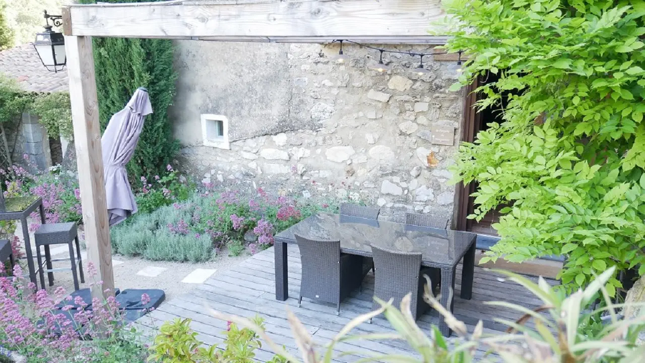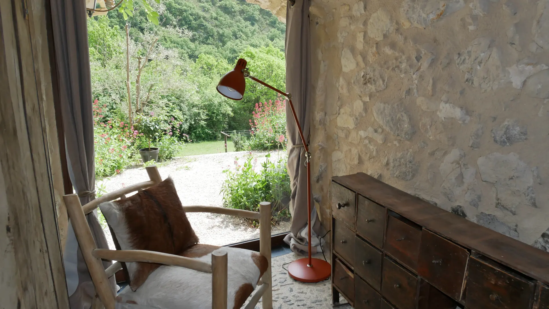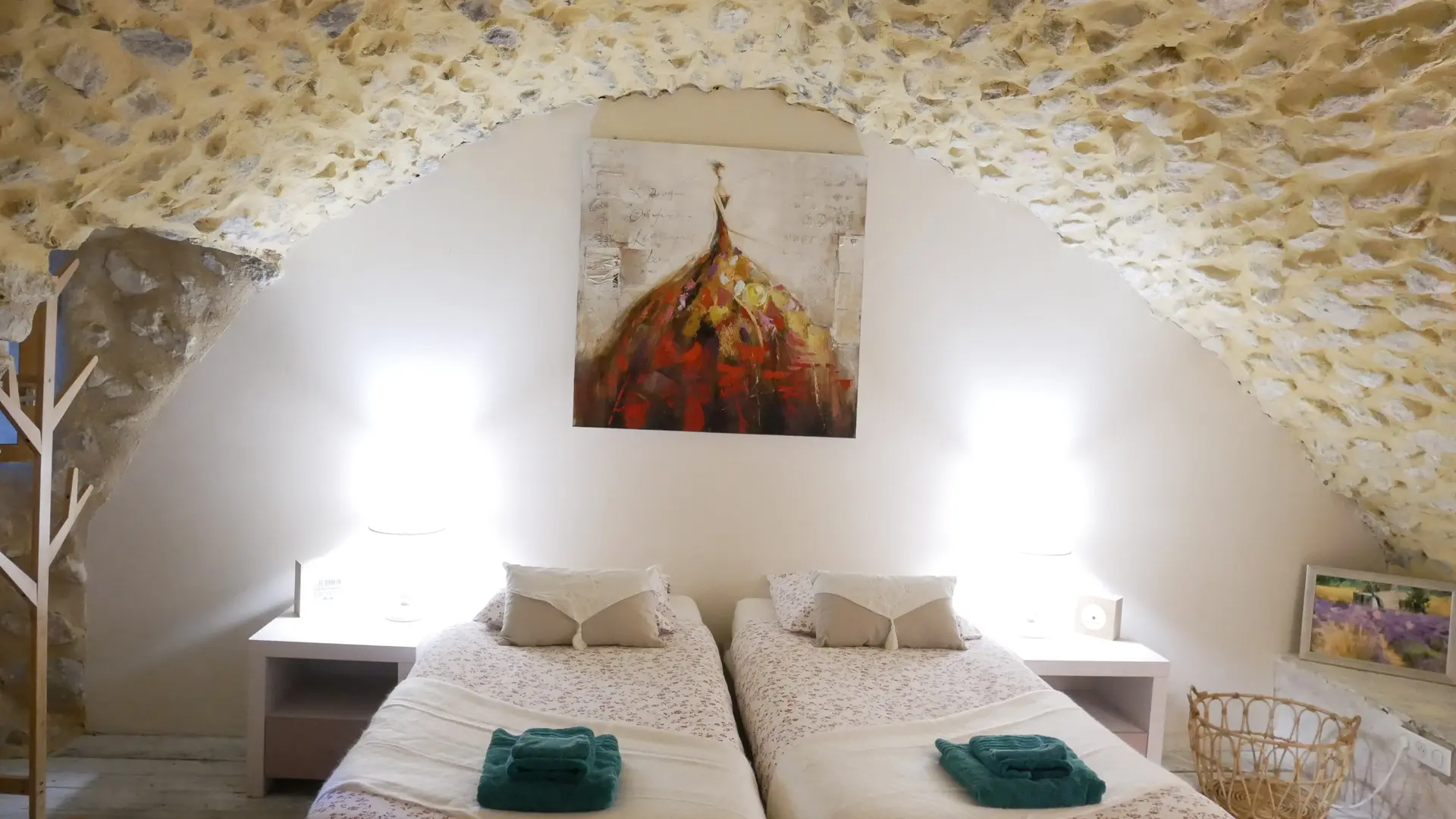 Gîte de charme de 72 m² en rez-de-jardin pour 4 personnes dans une ancienne bergerie au cœur de la nature, 2 belles chambres voûtées, terrasse privée avec jolie vue sur les montagnes environnantes. Grande piscine partagée. Calme et authenticité assurés !