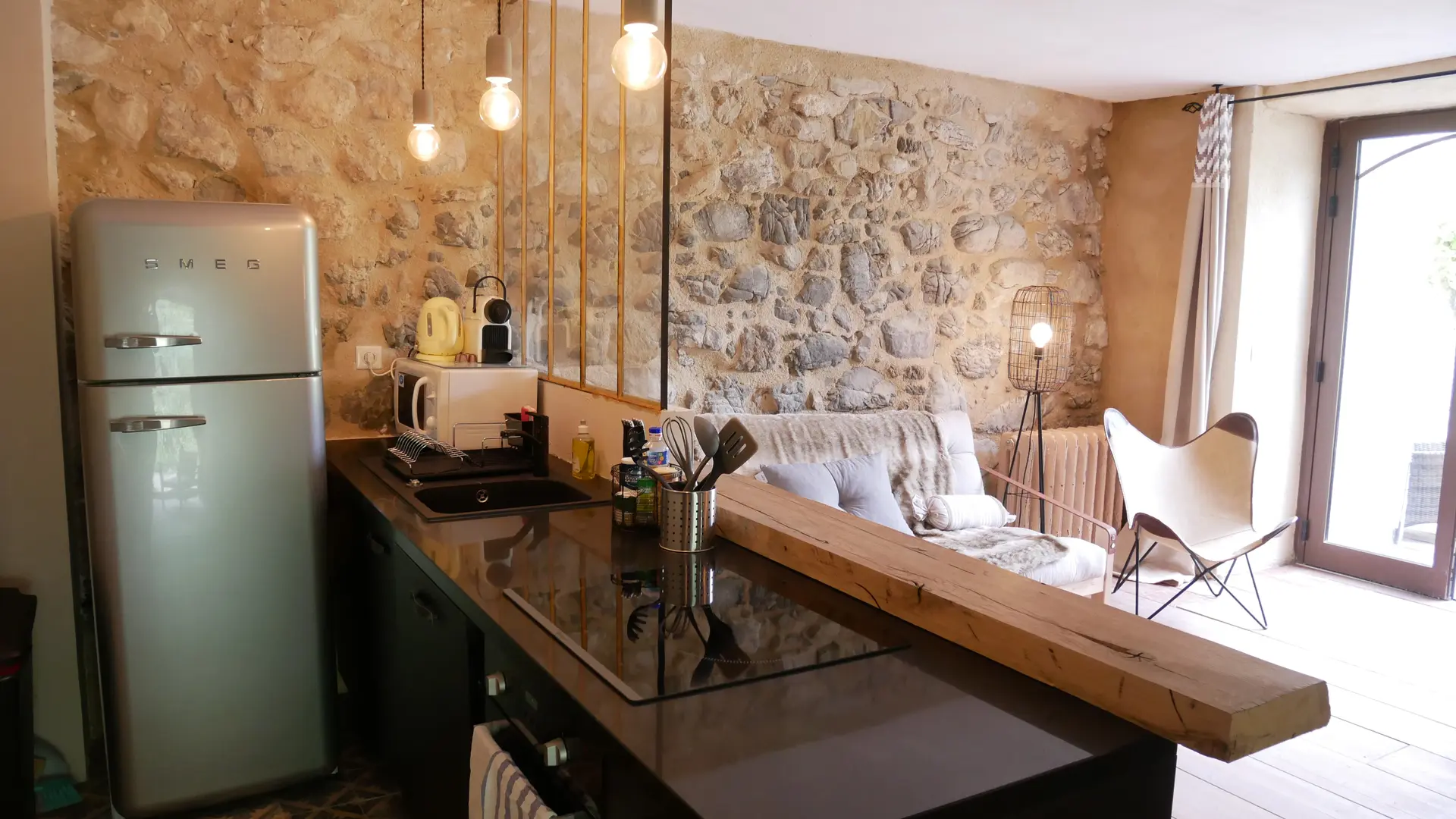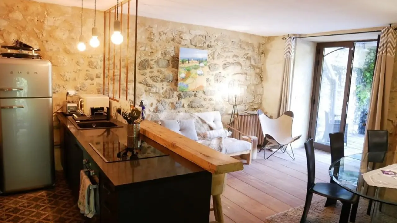 Notre gîte “La Bergerie de Marguerite”, aménagé et décoré avec soin, vous invite au calme dans son salon-séjour avec cuisine ouverte toute équipée. Avec ses 2 chambres sous voûtes en pierre, il offre une capacité de 4 personnes avec 1 couchage 160/200cm et 2 couchages 80/200cm. Une grande salle de bain avec douche à l’italienne, vasque, lave-linge et wc vient compléter ce bel appartement tout confort joliment décoré.