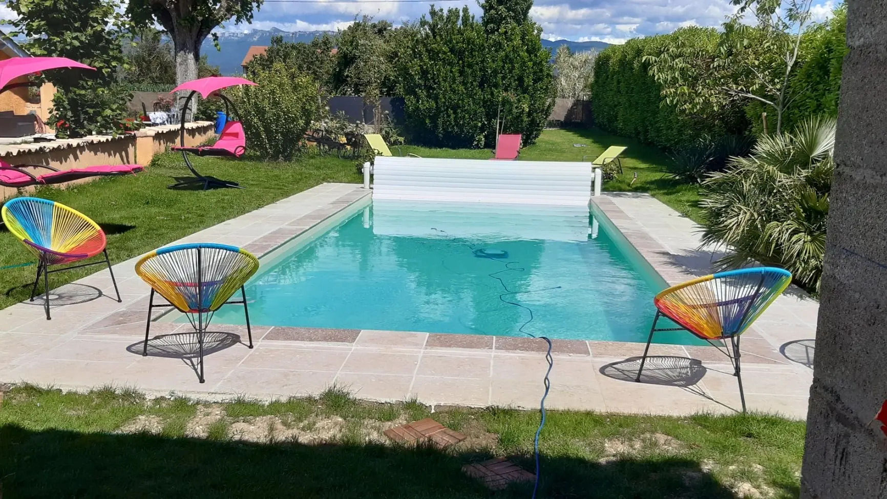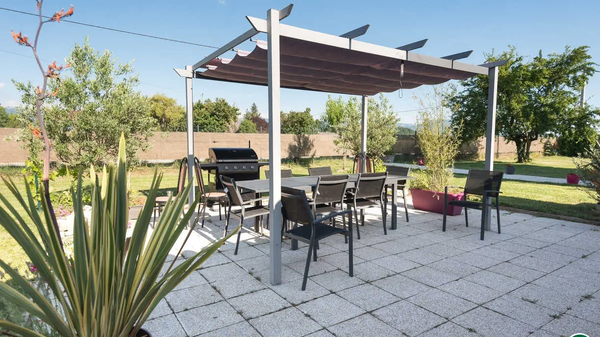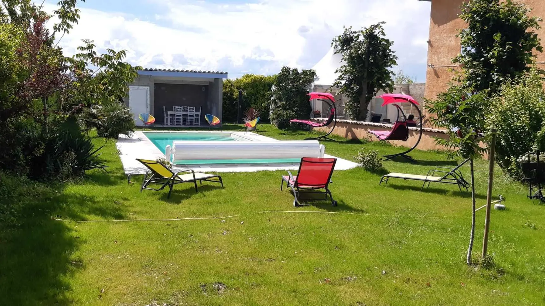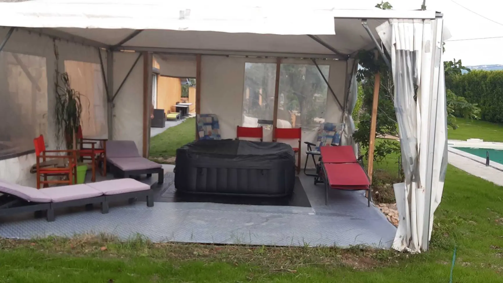 privative. Espaces extérieurs communs. Cour et Parking clos. TV dans la salle commune, salon de jardin. Jaccuzi et piscine chauffée à partir de mai