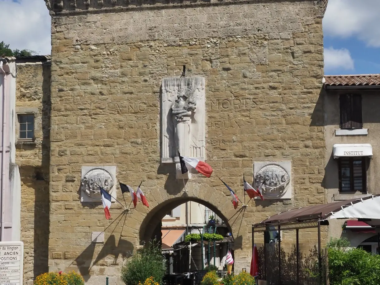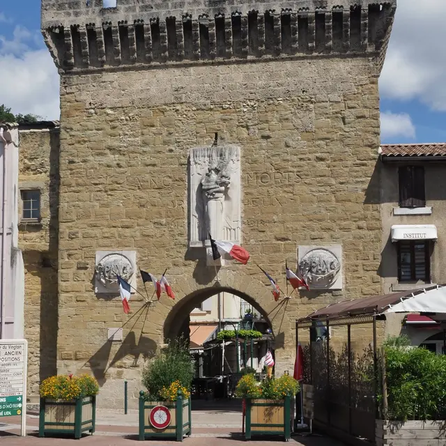 Construite en molasse, ses ferrures et rainures sous voûte prouvent l'existence d'une herse et d'une porte en bois. Un écusson aux armes des Princes de Monaco est martelé sur le tympan de la voûte. Une salle des gardes se trouve au 1er étage.