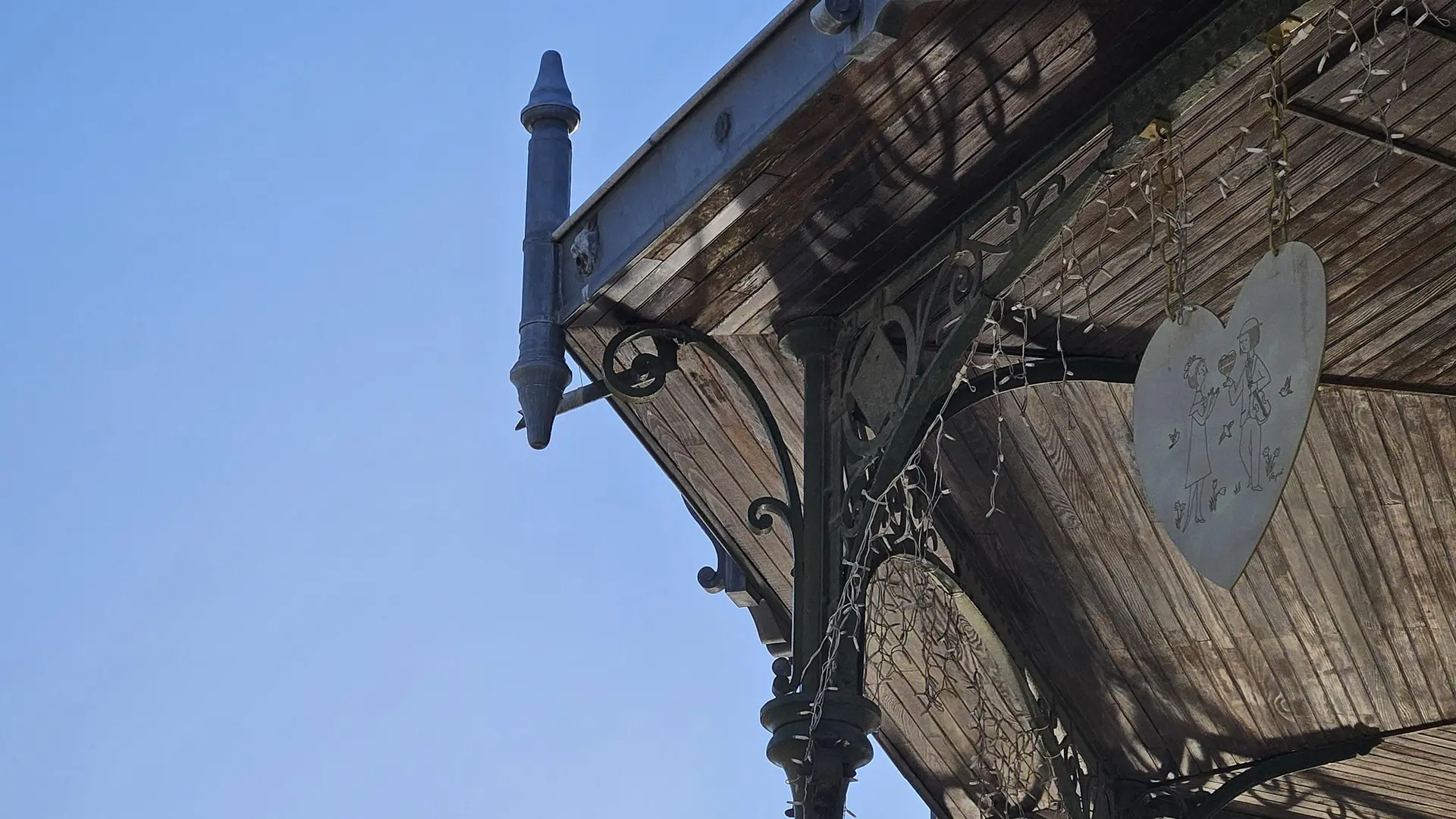Conformément aux codes architecturaux de l’époque, il est construit sur un soubassement en pierre de calcaire et composé de piliers en fonte surmontés d’un toit en zinc moulé, décoré de lyres.