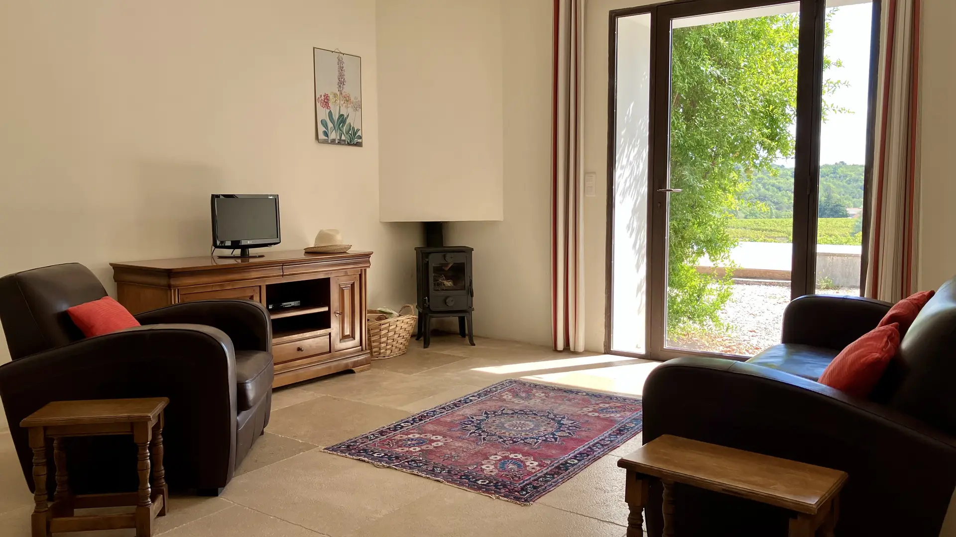Au milieu de notre domaine viticole, maison mitoyenne avec piscine, 2 chambres, cuisine/salle à manger, séjour, terrasse ombragée, au calme entourée de vignes et de lavande. Piscine 14m x 5m avec vue sur le vignoble et le Mont Ventoux.