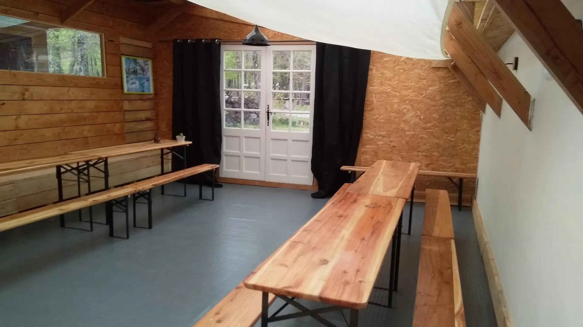 SANITAIRE : 7 WC + 7 douches + 20 lavabos, éviers, etc… • Ping-pong • Pétanque • Trampoline • Balançoire + Jeux pour enfants • Terrasses • Guinguette • Yourte de détente / lecture • 2 Barnums de 40 m2 chacun.