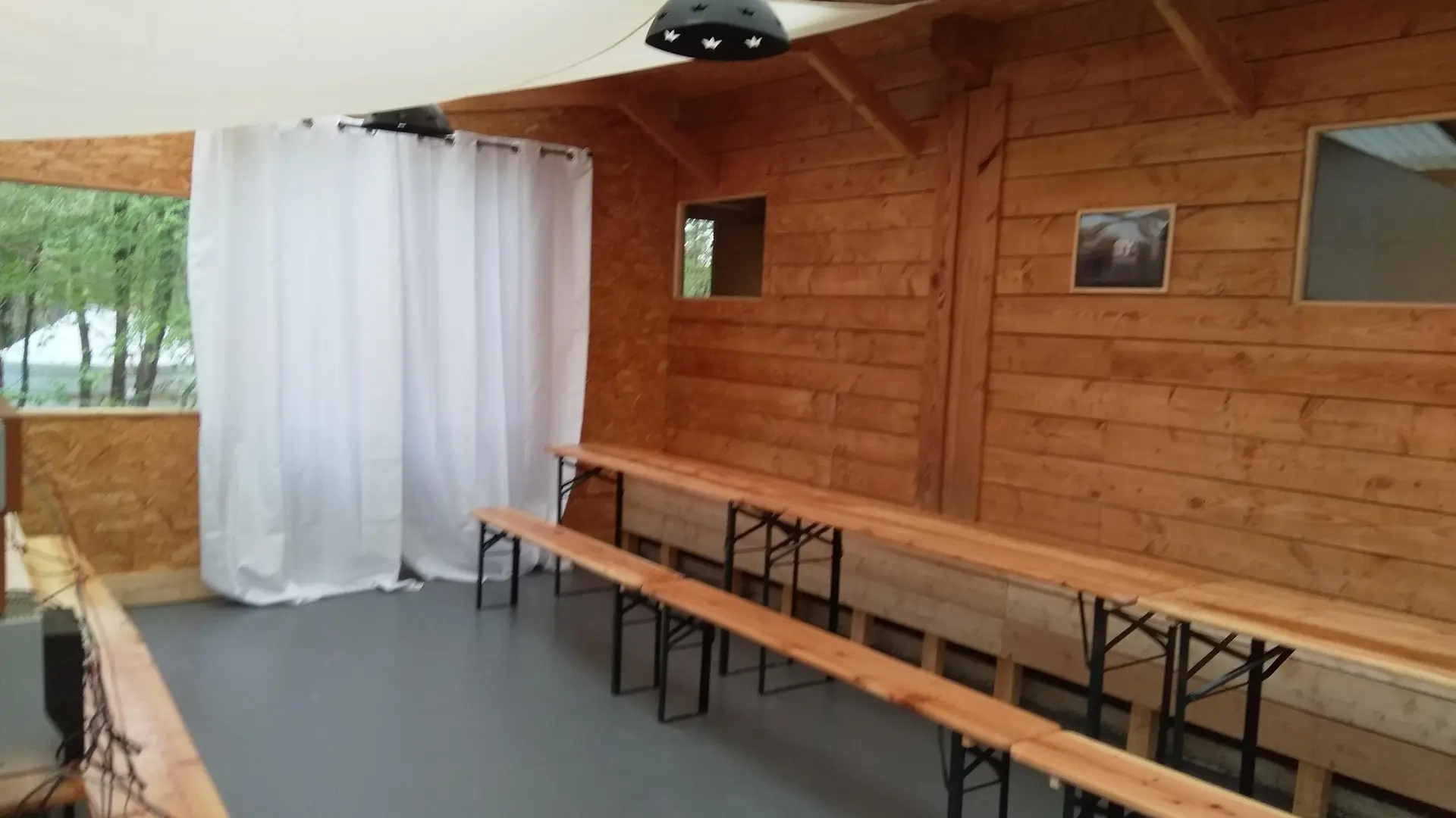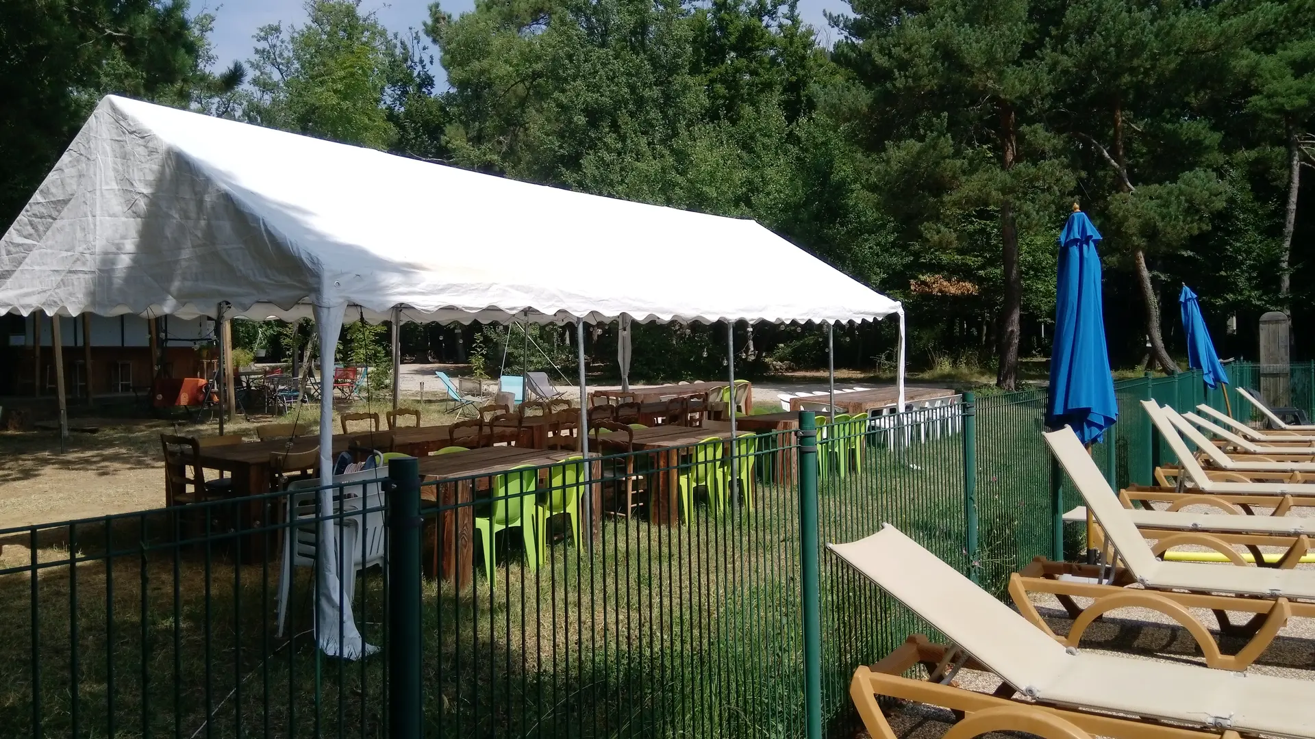 SALON D’ETE DE MAI A SEPTEMBRE = Salle de réception au centre du Domaine de 70m2 couverts •Capacité 80 pers debout / 60 pers assises en intérieur, avec mobilier amovible à disposition •Chaine Hifi Classique mise à disposition av prise Jack •Guirlande + 1 rallonge électrique + Mobilier de plein-air jusqu’à 100 personnes