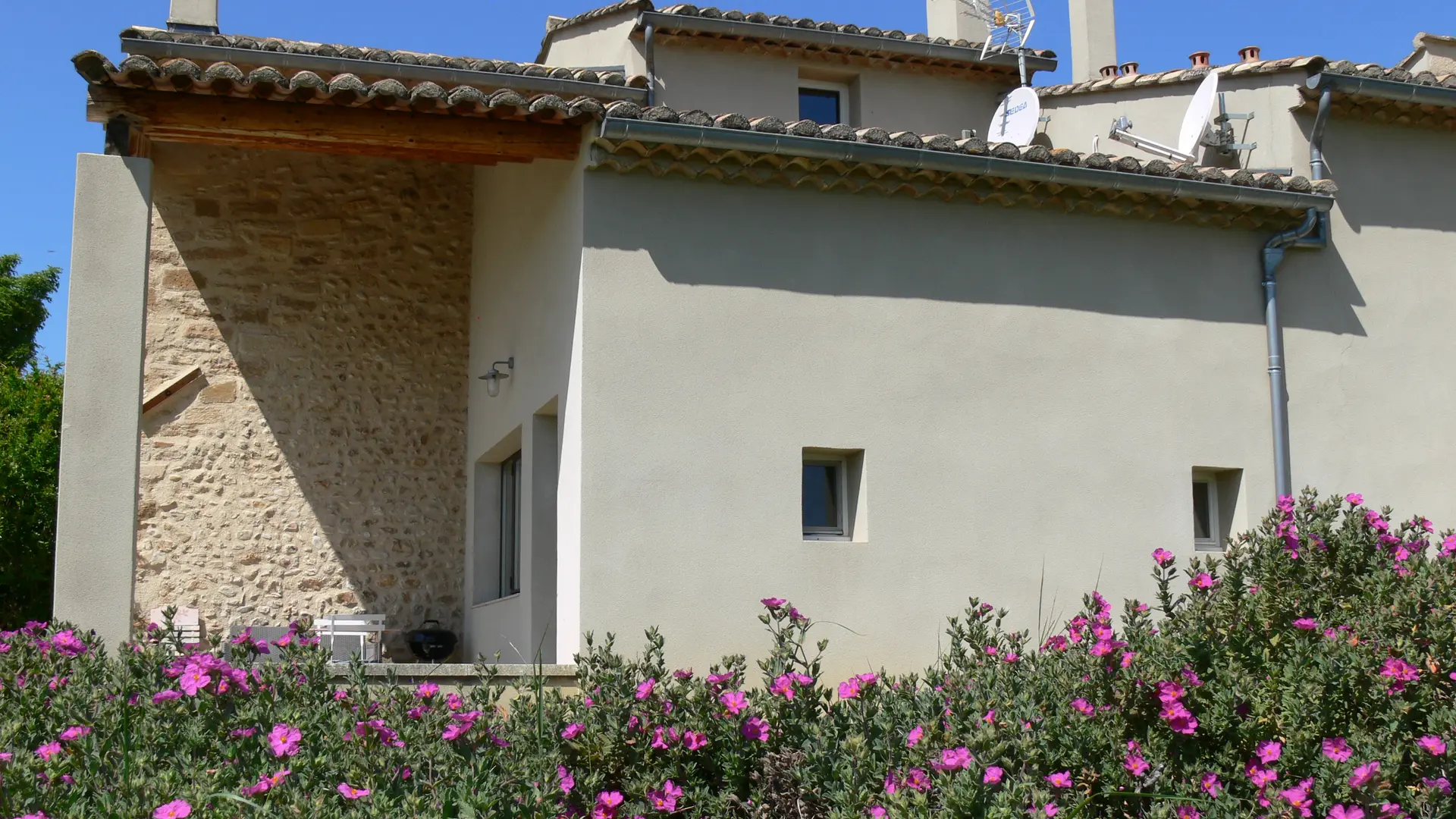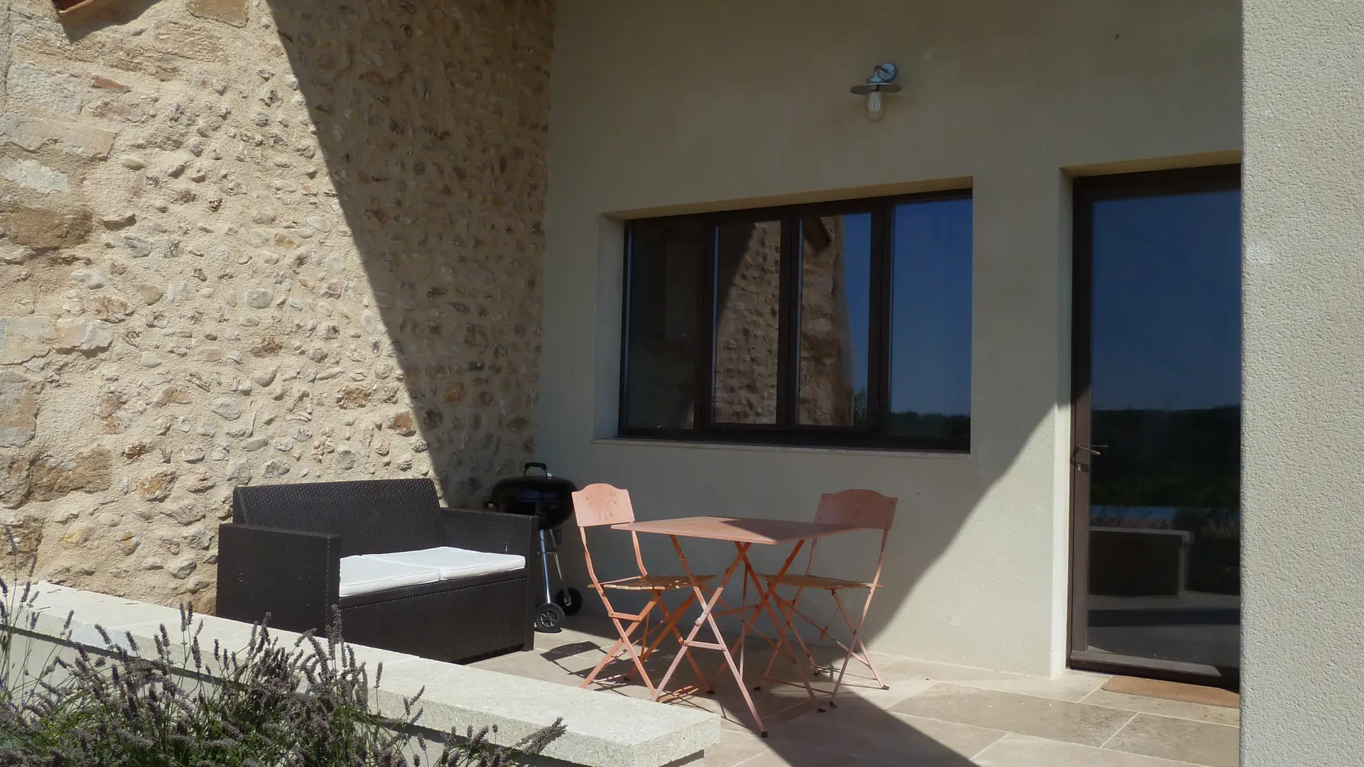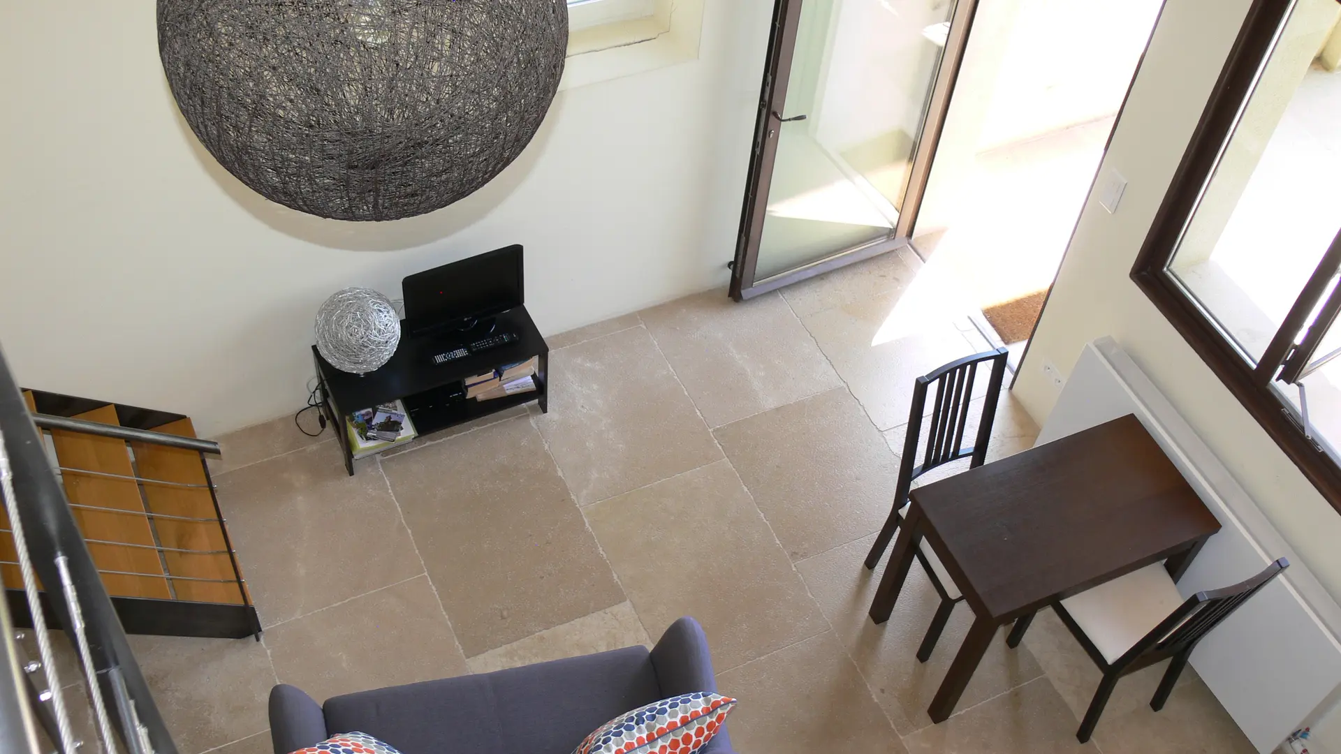 Notre appartement les Pré-Alpes est situé au sud du bâtiment principal. Sa terrasse couverte donne sud et est avec vues sur la piscine et, en arrière-plan, le Mont Ventoux.