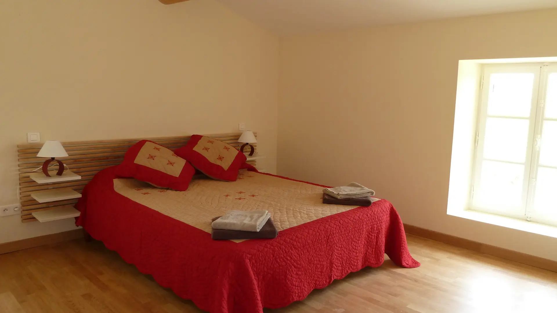 À l’étage se trouve une grande chambre avec, en suite, douche et WC. La chambre donne sur une terrasse privée avec vues vers les Pré-Alpes à l’est.