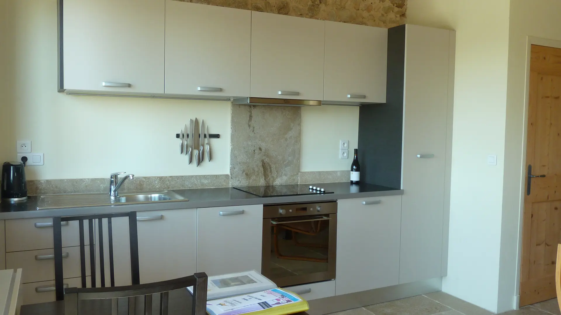 Appartement avec piscine. 1 chambre, séjour, coin cuisine/salle à manger et terrasse couverte au milieu de notre domaine viticole au dessus de Vinsobres et entouré de vignes et de lavande. Piscine 14x5 avec vues sur le vignoble et le Mont Ventoux.