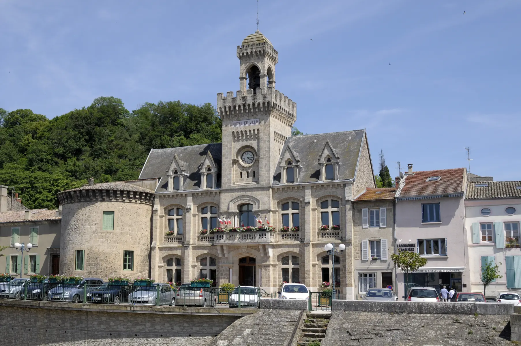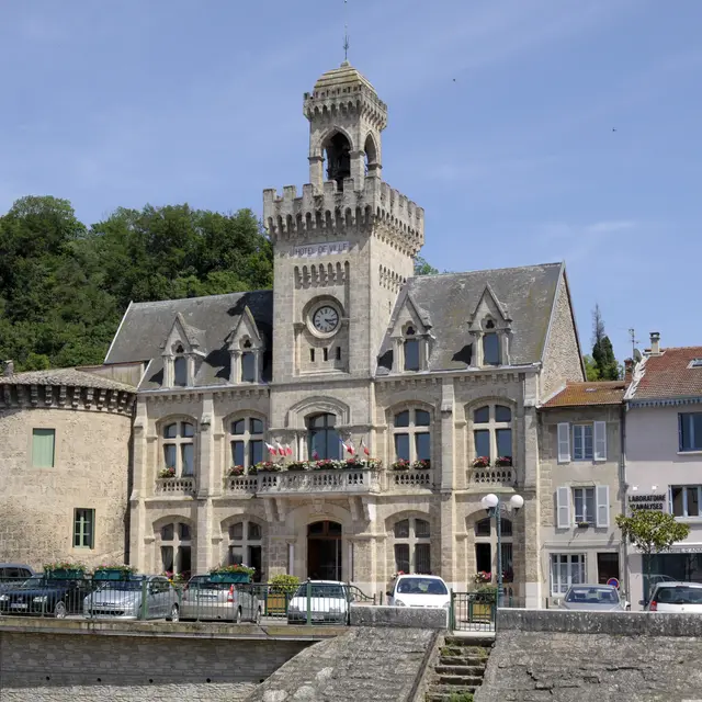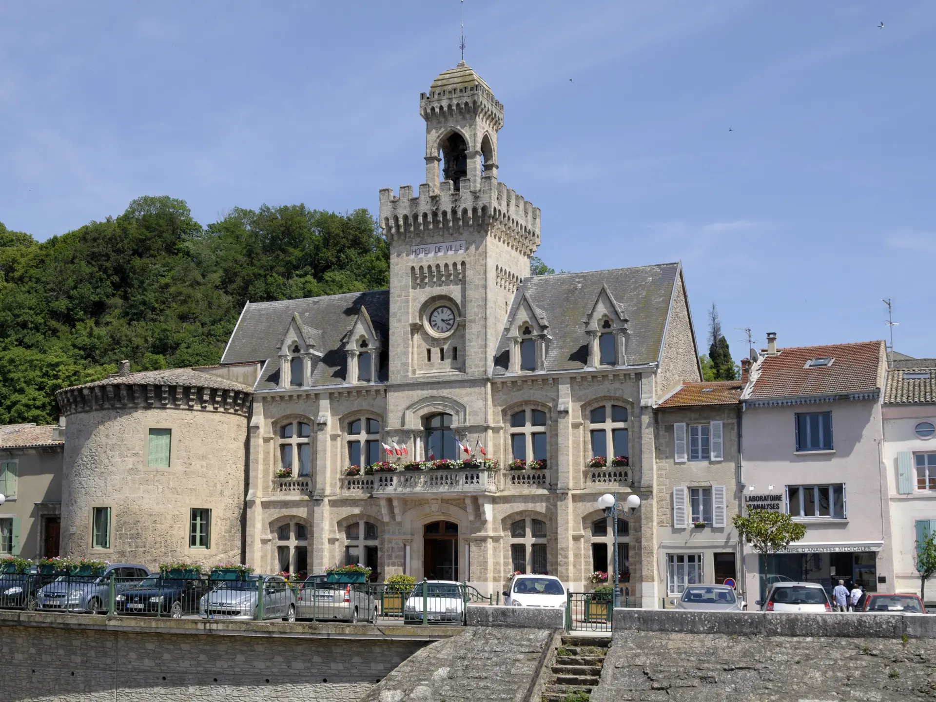 A gauche une tour ronde accolée à l'hôtel, vestige de l'enceinte médiévale, est l'un des rares éléments restant des anciens remparts.