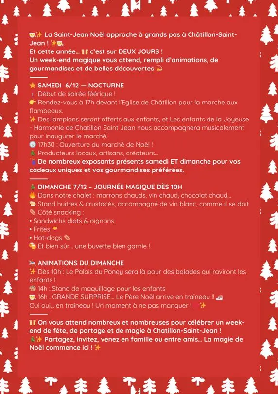 La Saint-Jean Noël approche à grands pas à Chatillon-Saint-Jean ! Et cette année… c'est sur deux jours ! Un week-end magique vous attend, rempli d'animations, de gourmandises et de belles découvertes ! Venez nombreux !