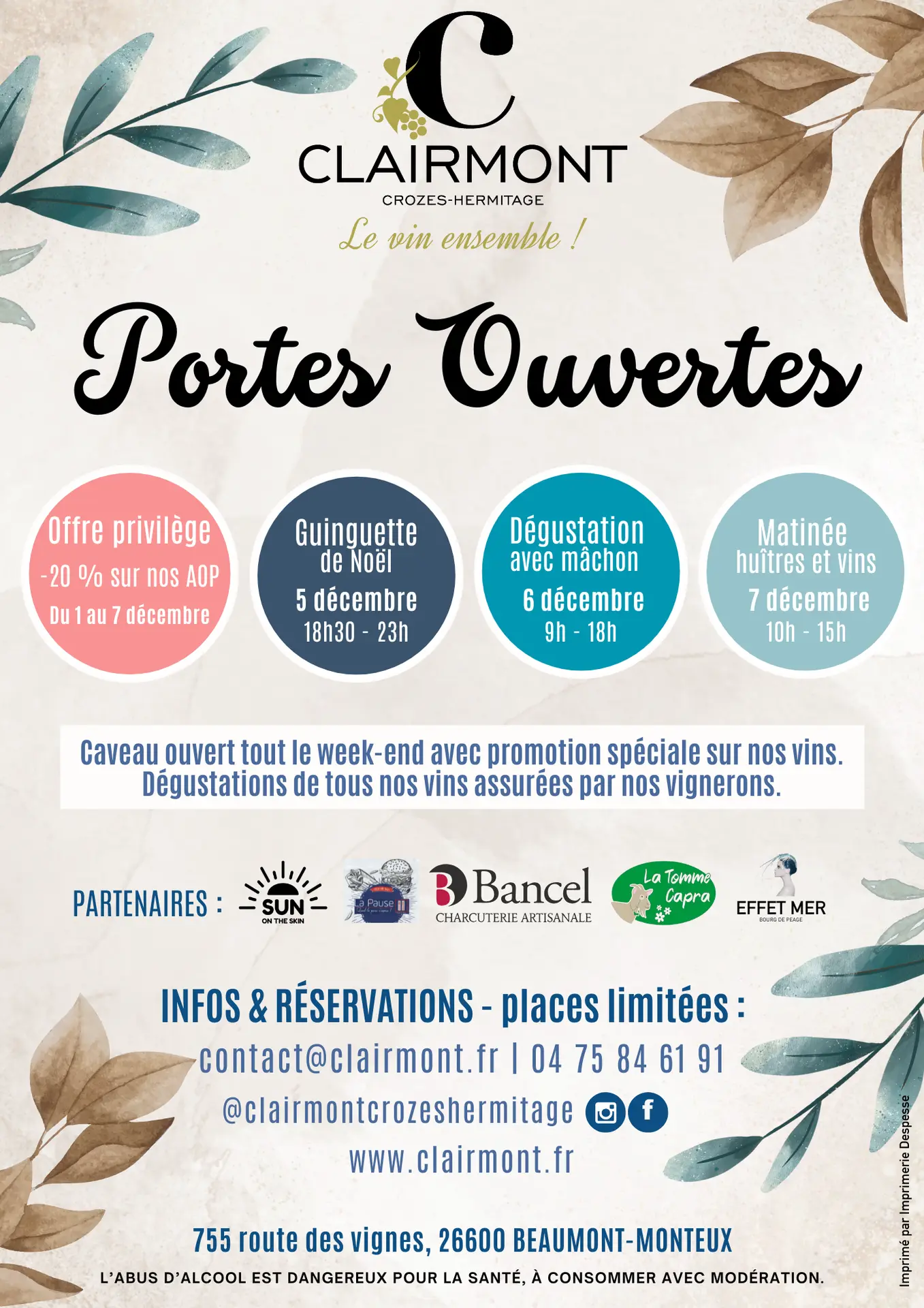 Du 1er au 7 décembre, profitez de -20% à partir d'une bouteille, sur nos AOP exclusivement, hors promotion déjà effective, au caveau et en ligne sur www.clairmont.fr