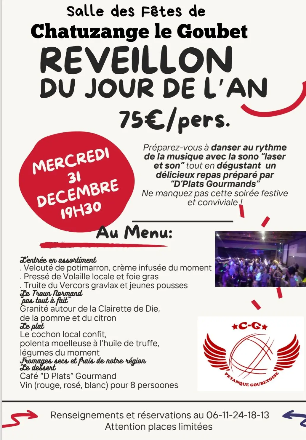 La C-G Pétanque Goubétoise organise sa soirée de Nouvel an : l'ambiance musicale sera assurée grâce à la sono "laser et son" et les plats à déguster auront été préparés par D'Plats Gourmands. Climat festif et convivialité seront au rendez-vous !