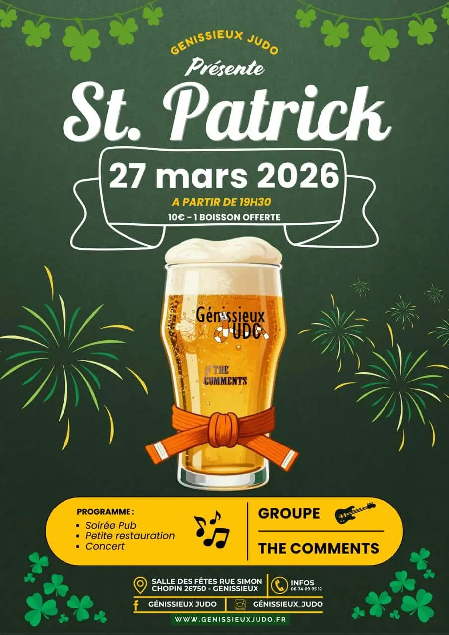 Le Génissieux Judo présente sa soirée Saint-Patrick auquel vous êtes attendus nombreux ! Au programme : soirée pub, petite restauration et concert du groupe The Comments.